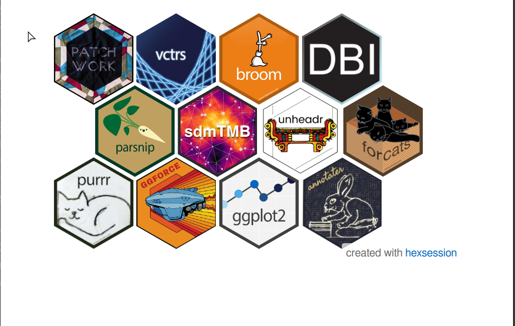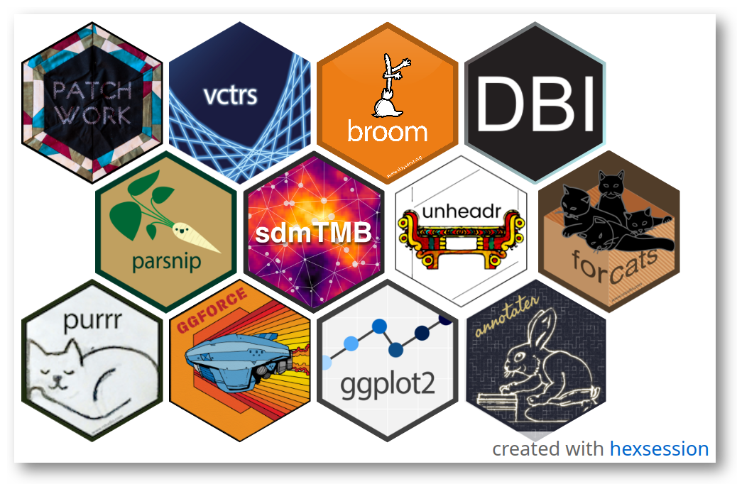 The goal of hexsession is to create a tile of hexagonal logos for packages installed on your machine. Tiles can be created for a set of packages specified with a character vector, or for the loaded packages in your session (all packages attached to the search path except for base packages). Also supports vectors with paths to local images.